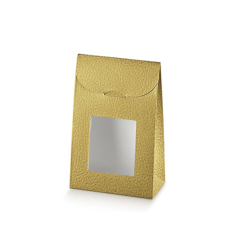 SCATOLA SACCHETTO PELLE ORO C/FINESTRA 17x7x23,5cm 10pz