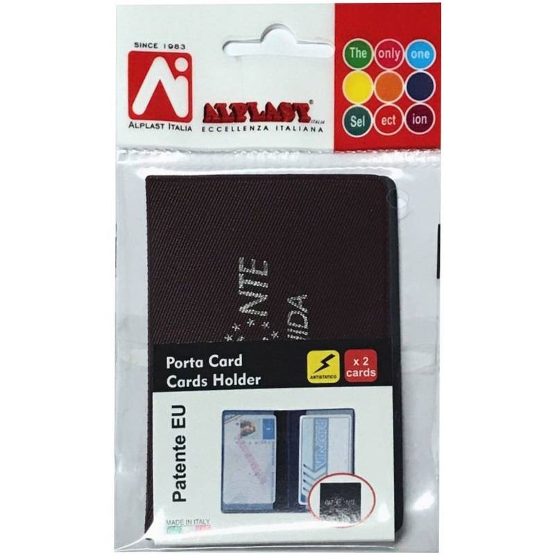 Copertina in pvc espanso sergè spessore 1,2 mm per la patente nel nuovo formato card, a 2 tasche con interni in pvc antistatico e fac-simile. Stampa a caldo.