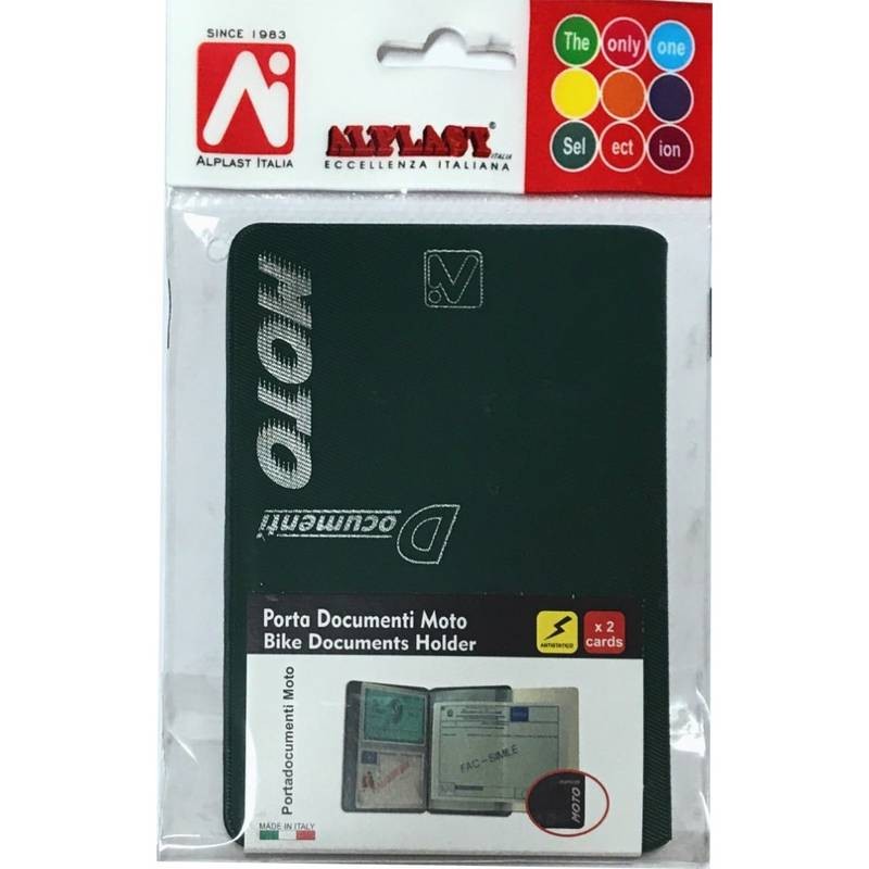 Copertina in pvc espanso sergè, spessore 1,2 mm stampa a caldo con dicitura in argento opaco, custodie in pvc antistatico per libretto, carta verde e due card, formato tascabile.