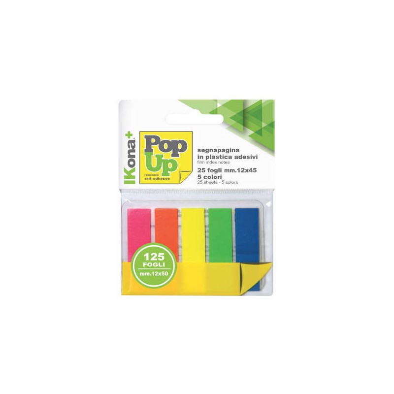 Segnapagina in plastica 5 pads. Ogni pads è composto da 25 fogli colori assortiti. Dimensione: mm.12x45. Colori assortiti.