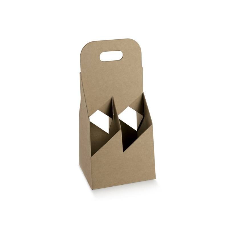 Cestello in cartone accoppiato per contenere 4 bottiglie, in tre differenti formati per birra, vino, olio e altre bevande.