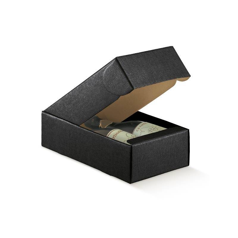Scatola per confezionare 2 bottiglie stese modello bordolese o borgognotta, oppure prodotti enogastronomici vari. Realizzata in cartoncino accoppiato, viene fornita con un separatore per le bottiglie inseribile successivamente al montaggio.