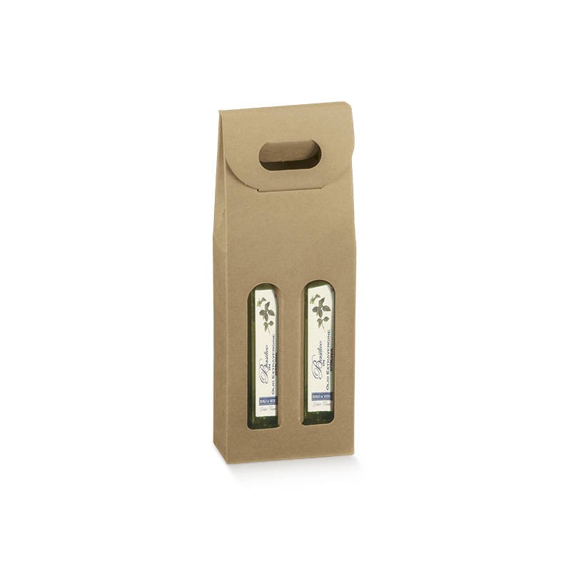 Scatola per confezionare 2 bottiglie verticali per olio modello Marasca, Quadra, Fiorentina oppure liquori. Realizzata in cartoncino accoppiato, con maniglia esterna e separatori costituiti dal cartoncino fustellato delle finestre.
