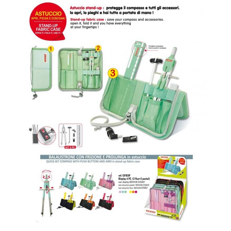 Astuccio in nylon con chiusura a cerniera per custodire il compasso e tutti gli accessori. Lo apri, lo pieghi, lo appoggi sul banco e hai tutto a portata di mano.