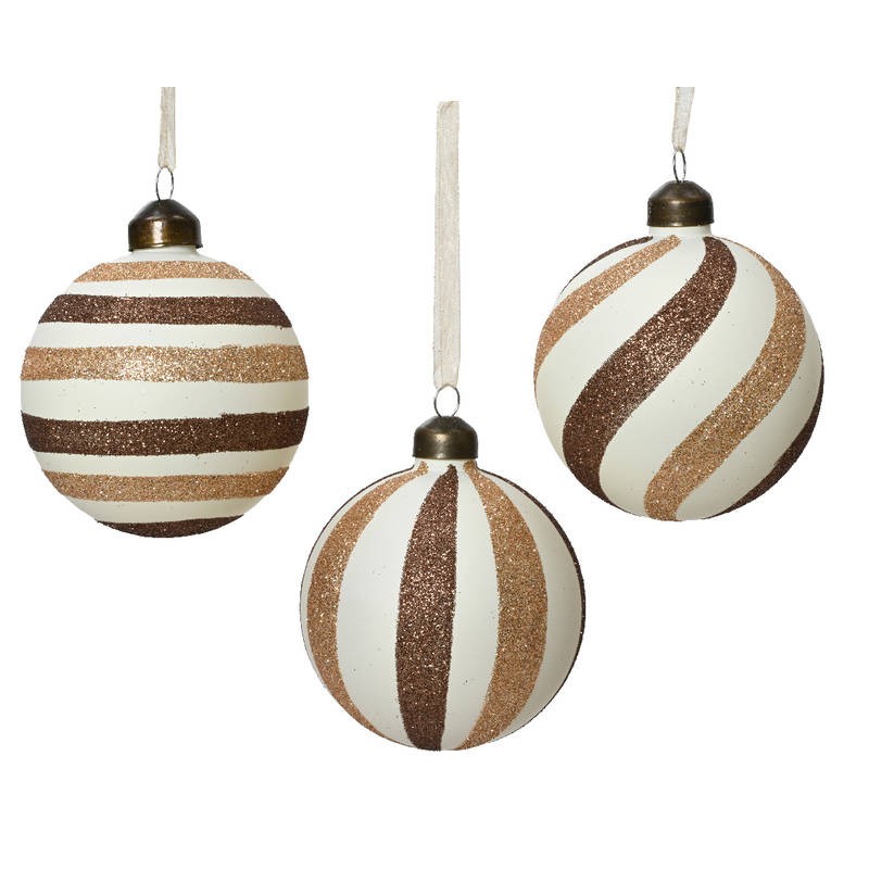 PALLINA Ø8cm GLASS WHITE BROWN GLITTER STRIPES 1pz