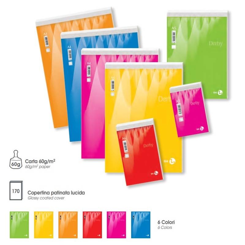 Blocchi notes derby A4 con carta da 60 grammi. Confezione da 10 pezzi, 6 colori assortiti scelti da noi per te! Made in italy.