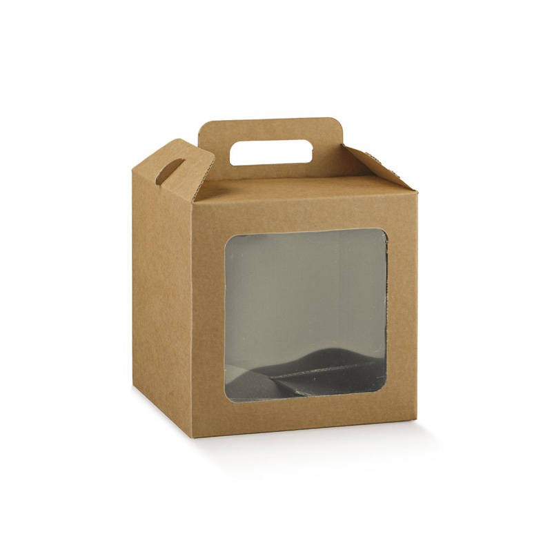 Scatola in cartone accoppiato per confezioni gastronomiche o articoli regalo con maniglia per il trasporto. La finestra trasparente è in materiale PLA biodegradabile e consente la visione dei prodotti.