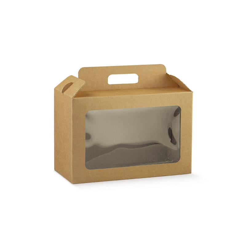 Scatola in cartone accoppiato per confezioni gastronomiche o articoli regalo con maniglia per il trasporto. La finestra trasparente è in materiale PLA biodegradabile e consente la visione dei prodotti.