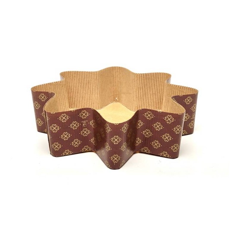 Stampo da cottura per Stella in carta di pura cellulosa in micronda, con esterno colore marrone e stampa floreale oro e interno colore ecrù, per 750 gr di prodotto.